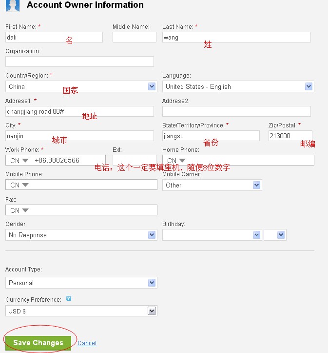 4:如图录入个人信息,点击save changes就OK啦。(注意,电话号码一定要填座机,随便填个8位数字,填手机的话其他人过户给你无法选择你的信息)